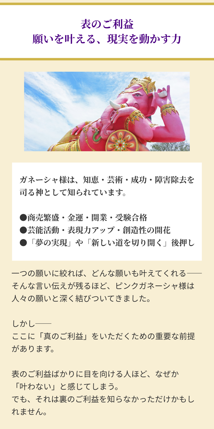 ピンクガネーシャ様は、あなたの「どこにも出せなかった想い」さえ受け止め、流れを変えてくれる存在です。